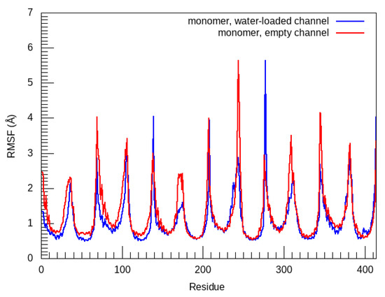 Root mean square fluctuation (RMSF) of the backbones of TMHC6 protein monomers (empty and loaded channels) during the MD simulation with crystallized structure [] used as a reference.