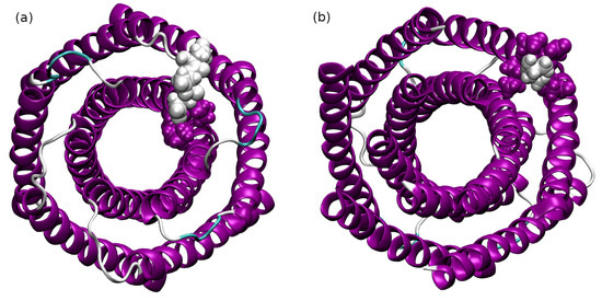 The most labile residues of the monomeric forms of the TMHC6 protein (depicted as Van der Waals spheres). (a) Empty channel; (b) water-loaded channel. Color coding: purple— helix; turquoise—turn; white—random coil.