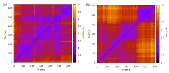 Pairwise RMSD of a fraction of monomeric protein models trajectories for the backbone atoms of chosen part of the sequence, namely, from residue 200 to 300. (a) Water-loaded channel; (b) empty channel.