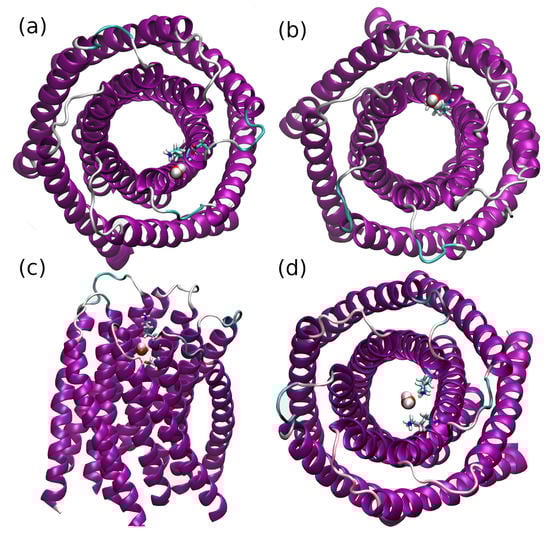 One of the first proteins that was computationally designed was Top7, which was synthesized in 2003, was 93 amino acids long and had a novel globular fold []. Another example is an enzyme designed in 2010 that catalyzes the Diels–Alder reactions and thus exhibits a functionality that is not found in nature []. In fact, nowadays, theoretical biologists and chemists can design much bigger and more intricate proteins, such as specific enzymes or big 12- or 16-helix transmembrane channels []. In the current study, the TMHC6 protein (shown in Figure 1) is discussed. The protein was designed computationally from scratch by Baker’s group []. The protein backbone generation was performed with the use of Crick’s coiled-coil parameterization, a hydrogen bond network was built, and combinatorial sequence optimization was performed, keeping networks that are polar fixed. After all of these steps, Rosetta’s fold-and-dock program checked the extent to which the obtained sequences build the designed target topology. Synthetic genes that encode the protein of interest were expressed in the E. coli model organism. The crystallized protein closely matched the computational model. Then, outer regions of the transmembrane protein were reshaped in order to obtain more polar water-exposed residues. The TMHC6 is a complicated 6-chain, 12-helix transmembrane protein, and patch–clamp experiments provided evidence that it has selectivity towards potassium ions. It is probably caused by characteristics of the narrowest regions of the channel that are composed of glutamate, lysine, and leucine rings, that is, specially designed rings formed by six residues in the symmetrical helical chains forming the TMHC6 hexamer and lay on the same height, as depicted in Figure 2a of Ref. []. In comparison, sodium ions had significantly lower conductance than K+, what can be explained in terms of hydration shells of the Na+ and K+ cations. Both of these cations are hydrated by water molecules, but as experiments have shown, K+ and its hydration shells are thermodynamically less stable []. Due to this fact, sometimes potassium ion can lose its shell, because the more favorable interactions with carbonyl groups of amino acids will be formed. The same cannot be said about sodium ions—they are significantly more demanding in order to lose their hydration shell; thus, their conductance is meaningfully smaller than for K+. Selectivity towards potassium ions is a great example of designing proteins with desired functionalities and it shows the possibilities that are unfolding for protein engineers. From the perspective of the computational chemist, it is also important to determine whether the designed protein capabilities can be foreseen in silico, where the possible problems with our computational models exist, and to determine how to refine them in order to describe biochemical phenomena correctly [].