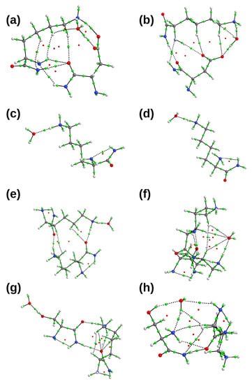 Atoms in molecules molecular graphs for the investigated models of water–channel interactions. Green spheres—bond critical points; red spheres—ring critical points. Atom color coding: gray—carbon; white—hydrogen; red—oxygen; blue—nitrogen. (a) Asp–Lys–Water (gas phase); (b) Asp–Lys–Water (PCM solvent); (c) Lys–Water (gas phase); (d) Lys–Water (PCM solvent); (e) Lys–Lys–Water (gas phase); (f) Lys–Lys–Water (PCM solvent); (g) Ser–Lys–Water (gas phase); (h) Ser–Lys–Water (PCM solvent).