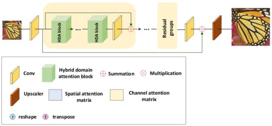 To address the above problems, a novel framework is proposed in this paper, called a Hybrid Domain Attention Network (HDANet), for single-image super-resolution, which is illustrated in Figure 1. It introduces the self-attention mechanism of the Transformer [] to improve the inference efficiency of the network. Specifically, in this paper, two parallel self-attention modules are added to the feature extraction process, namely, the spatial self-attention module and the channel self-attention module. The spatial self-attention module captures key image information (e.g., edge and texture regions) and adaptively finds the regions in the image information that need to be attended to. The channel self-attention module captures the interdependencies between different feature channels and adaptively reinforces the important channels to suppress the non-important ones. The two modules work in concert to further refine the redundancy calculation. Such a hybrid domain self-attention mechanism enables the network to bypass low-frequency information and focus on more useful information to effectively accomplish the task of image SR reconstruction [].