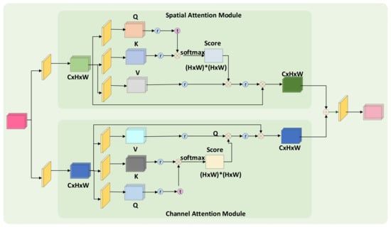 Suppose the feature map input to the spatial attention module is , and after convolution, the feature map is obtained, which is denoted as Query, Key and Score, respectively. The operation can be expressed as follows: