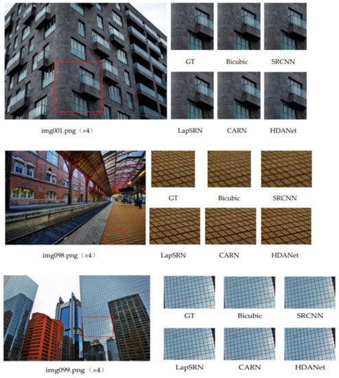 The visual results of image SR reconstruction are shown in Figure 4. The images used for testing are selected from the public dataset Urban100, and the comparison shows that the HDANet method generates clearer images with better details and higher contrast, and HDANet has significant improvements over Bicubic, SRCNN, VDSR, LapSRN, and CARN. For example, in terms of the 4-magnification effect of image img001, it is obvious that the stripes of the buildings in the image generated by HDANet are clearer, while the stripes of the buildings in the image generated by other methods are very blurred and have obvious distortion compared to the original image.