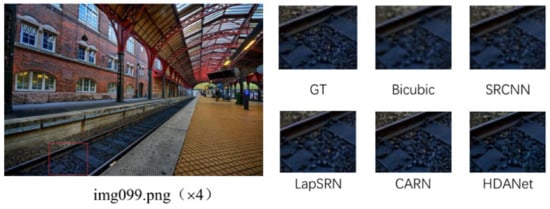 To verify the sophistication and validity of the model, HDANet is compared with Bicubic, RDN-DAQ, SRCNN, VDSR, LapSRN, and CARN in this paper. Quantitative results are shown in Table 2 and visualization results are provided in Figure 3. The implementations of these methods are based on the officially released source code and their experimental results are evaluated using the trained weights. As shown in Table 3, the proposed HDANet achieves the highest PSNR and SSIM on most of the datasets for the current state-of-the-art methods. For example, for ×2 SR, HDANet achieves better performance than CARN with 4a 1% and 33% reduction in FLOPs and parameters, respectively. With comparable model sizes our HDANet achieves better thrust efficiency in terms of FLOPs (66.7 G vs. 118.8 G). With comparable computational volume (40.5 G vs. 52.7 G), HDANet has 30% fewer parameters. For ×2/3/4 SR, our HDANet achieves much higher PSNR and SSIM values than VDSR, but its FLOPs values are much smaller than VDSR. These results show that our approach overcomes the dilemma caused by the performance improvement well, achieving high PSNR performance and low computational cost.