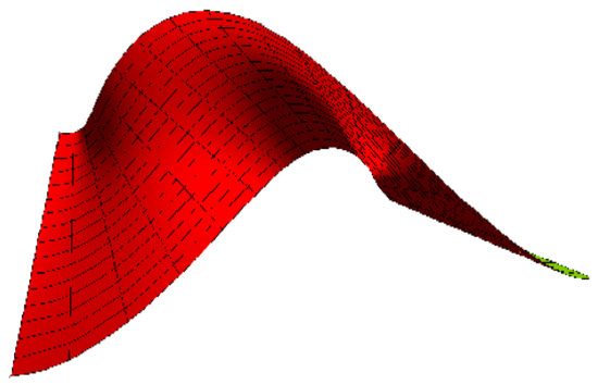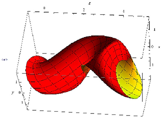 Obviously, it does not satisfy Theorem 3, that is . This means that a cylinder in a commutative group is developable, but a cylinder in a three-dimensional Lie group is not developable. More explicitly, since , then is a constant. If or π, the developable surface is a cylinder. If we take for example, then M is shown in Figure 3. Take for example; the developable surface: