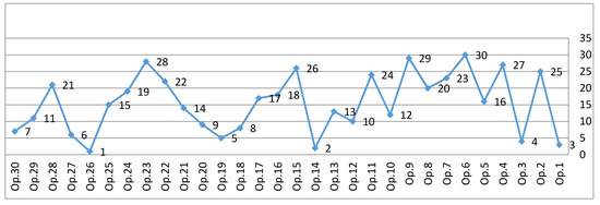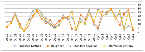 In this part, different weighting methods were used to derive criteria weights: rough set theory [43], information entropy [29] and stander deviation [44]. To compare the results obtained using the proposed approach, these weights are combined with CoCoSo and REC to estimate the preference rankings of the alternatives. Table 14 presents the derived weights of the parameters, with corresponding results shown in Figure 5. Based on the comparison analysis (Figure 5), Op.26 is identified as the best SVC parameters setting compared to all other weighting alternatives combined with CoCoSo and REC. Similarly, the ranking position is the same as when using the SMFRA combined with CoCoSo and REC method. In order to analyze the relationship between the selected weighing methods and the proposed REC method, Spearman’s rank correlation coefficient (SRCC) was employed. Across all methods, the correlation coefficient was more than 0.89, except for the rough set (0.71). All methods show a strong correlation with each other based on these results.