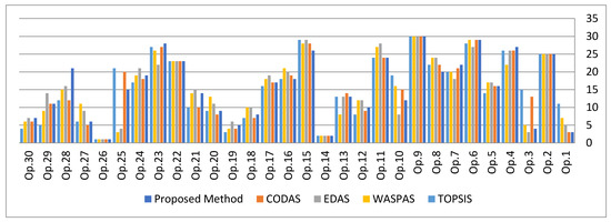 The results in Figure 6 show that the proposed method does not differ much from other MCDM methods, except for the ranking of middle-rated alternatives. Setting point 26 attracted the greatest attention across all techniques, suggesting that it is the most suitable. In addition, SRCC is used to compare the ranking results achieved using various methodologies. As SRCC is more than 0.9, the ranking of alternatives has excellent correlation. SMFRA can obviously minimize the parameters of input space and calculation difficulty when dealing with datasets with a large number of input variables, improving the decision-making process and selecting a good alternative.