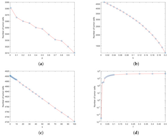 In the third test, we fix , and , but s takes a value of 0 to 100. The parameter s represents the constant input of the chemotherapeutic drug. Figure 2c shows that the tumor cell number changes slightly when the drug input constant is changed. This indicates that the model is not particularly sensitive to parameter s, which suggests that we cannot achieve the therapeutic effect by increasing the drug input dose alone.