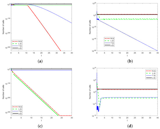 Numerical simulations of the model for four equilibrium states. (a). Dead equilibrium state . (b) Tumor–free equilibrium state . (c) Tumor–present equilibrium state . (d) Coexisting equilibrium state .