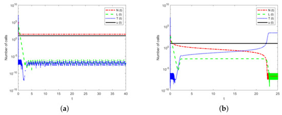 Figure 4 shows that different hosts with different immune system strengths have different influences on tumor cells treated with the same drug. Figure 4a shows that, after a period of treatment, only NK cells and chemotherapy drugs remain in the host. Figure 4b suggests that, under the same chemotherapeutic drug, a large number of tumor cells are present in the host when the immune system is weaker. These results suggest that a host with a stronger immune system can eliminate a small number of tumor cells under a single chemotherapy. Therefore, treatments that increase the strength of the immune system should be developed, which is a different treatment scheme (i.e., immunotherapy).