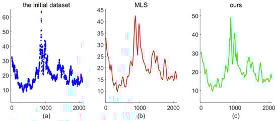 A stock price fitting by moving least square (MLS) and ours. (a) The price data of a stock. The abscissa represents the time (day) and the ordinate represents the price; there are 2130 data points. (b) The fitting curve obtained by MLS. The number of nodes is 100, the weight function is cubic spline function, and the basis function is . (c) The fitting curve obtained by the method proposed in this paper; the number of control points is 100.