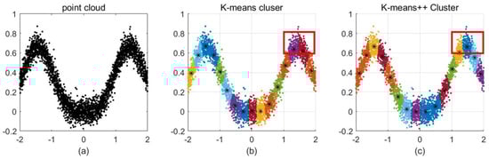 Point cloud clustering using the K-means (b), and K-means++ (c) methods. (a) shows the point cloud composed of 6248 data points. (b,c) shows the 16 clusters of the same point cloud by the two methods. It can be seen from the two figures that the red rectangular area is an extreme region of the point cloud; the K-means clustering method divides the region into two clusters and generates two cluster centers, but the K-means++ method generates a cluster in the region and forms a cluster center, which can better protect the shape of the point cloud.