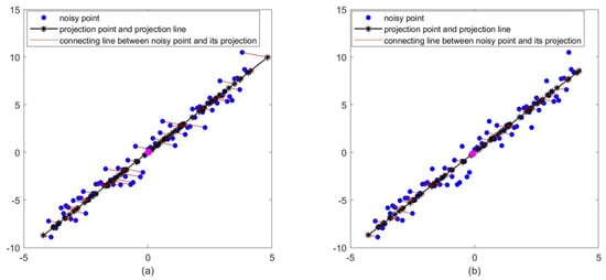 Next, we continue to use the method in Section 3.1 to recalculate the main line and main control point of the point cloud, as shown in Figure 4; (a) presents the noisy data (blue dots), its projection points (black asterisks), and the projection line; (b) shows the projection line and projection points after removing the outliers by principle. The points not connected by solid red lines represent the outliers. Compared with (a), we find that the projection points in (b) are more concentrated, and the points far away from the projection line are removed.
