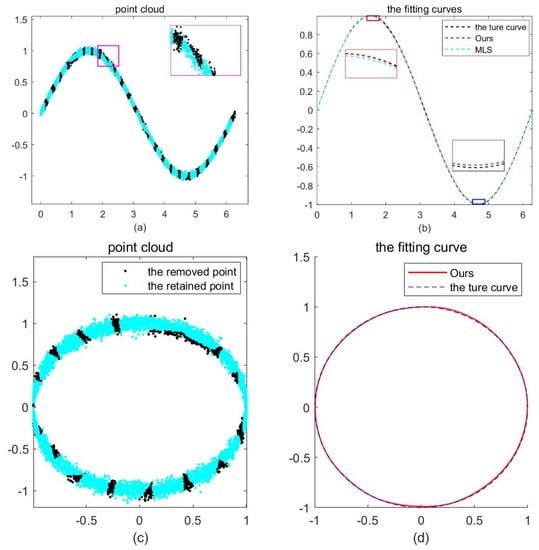 Figure 5c is a closed curve point cloud generated by function . There are 6284 data points. The removal rate of the point cloud is 12%, and the cyan points are reserved points. The MLS method cannot generate the fitting curve of the closed curve. Figure 5d shows the fitting curve generated by our method, which basically coincides with the original curve.