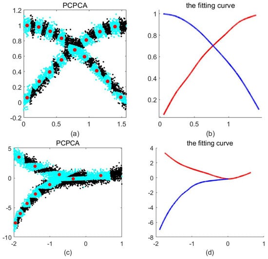 Figure 6a,c shows the curve fitting of -type and -type point clouds. For the fitting of these two types of point clouds, we first cluster the point cloud into several clusters, and then find the main control points and main directions through PCA. Combined with the main directions, we divide the main control points into two groups and sort each group of points. Finally, the limit curves are obtained by the subdivision method for two main control points, as shown in Figure 6b,d; the two real curves (red and blue) in the figure correspond to the two curves fitted by the two main control point sets, respectively.