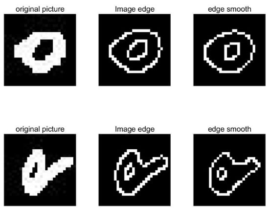 Image edge smoothing. The first column is two images from the digital image set MNIST. The second column is the edges of the two images obtained by the Canny algorithm. The third column is the smoothed image edge.
