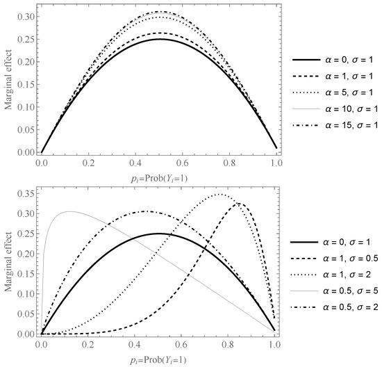 Marginal effect of the skewed logit model with different values of skewness parameters and . The case , corresponds to the classical logistic specification.