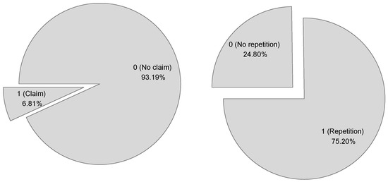The dataset considered here is well-known in the actuarial literature. It is based on one-year vehicle insurance policies in 2004 or 2005. There are n = 67,856 policies for which the binary dependent variable is expressed as a collection of ones and zeros, with one representing the occurrence of at least one claim. A pictorial representation of this dependent variable is shown in Figure 3. A significant imbalance in the two categories of outcome considered can be observed. In this case, the portfolio contains 4624 (6.8%) of policyholders who had at least one claim. The description of the explanatory variables associated with the claims considered in this work is as follows: