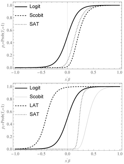Figure 4 displays the cdf of the three models considered by using the parameter estimates exhibited in Table 2 and Table 3. It can be seen that for the scobit and SAT models, the approximation of p to 0 is faster than the one for the logit model, as expected. In contrast, the approximation to the value 1 is slower.