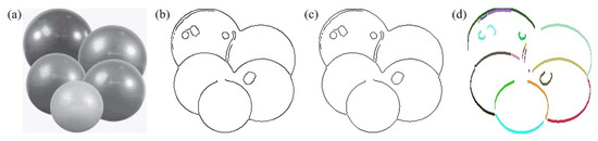 The purpose of image preprocessing is to reduce the image noise and extract edges. We used a 5 × 5 median filter to reduce the noise. Then, we adopted the Canny [36,37] edge detector to obtain contour curves, as used by most circle detectors. Figure 2a shows a test image, and Figure 2b shows its contour curves.