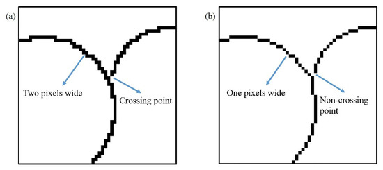 The contour curves were multiple pixels wide, because Canny evaluated the pixels in an isolated manner to extract edges [29]. These curves contained many crossing points. Figure 3a shows a simple case. A one-pixel-wide contour curve can accurately describe a circle, while multi-pixel-wide curves will lead to computational redundancy. Therefore, the multi-branched contour curves with crossing points needed to be transformed into non-branched contour curves to facilitate the extraction of the arc. Deleting redundant pixels and crossing points can solve the two problems, as shown in Figure 3b.