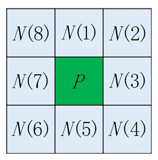 where N(p) is the number of foreground points in the eight-neighbor of P, N(1~8) is the eight-neighbor of P, as shown in Figure 4, and Nc(P) is the number of foreground pixels in N(2), N(4), N(6), and N(8). We specified that the contour curve pixel logical value is 1 (true), and the background pixel logical value is 0 (false). Conditions (1)–(4) should be applied in a logical order. The part without pixels is treated as background pixels when P is on the image’s border. The effect of contour curve refinement is shown in Figure 2c.
