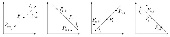 According to Equation (7), k will be larger when a contour curve has multiple arcs, as shown in Figure 5c. Since a larger k value will smooth the curve, it makes the corner points among the arcs remain undetected. It is more likely to occur when the curvature of the corner points is similar to that of the arc. Therefore, we introduce the positive–negative point detection scheme [40] to improve the corner detection ability. As shown in Figure 7, line li is formed by Pi−k and Pi. The relative position of Pi+k and li is used to determine the symbol of Pi. Pi+k is defined as a positive point when Pi+k is in the clockwise rotation direction of li or on li. The symbol of Pi is set as ‘+’ when Pi+k is a positive point. Figure 7 shows the four positive point cases. Similarly, it is defined as a negative point when Pi+k is in the counterclockwise direction of li, and the symbol of Pi is ‘−’.