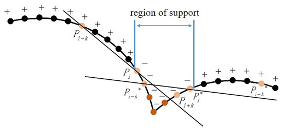 For the analysis of contour curves shown in Figure 2c, there were only a small number of corner points on these curves. A curve had a high number of positive or negative points, and corners existed in the region where a smaller number of symbol points were located. These points with a smaller number of symbols are called support points. Each section of consecutive support points is called the support area, as shown in Figure 8. For each support area, set k to 3 to finely locate the corner points. The point with the largest R(Pi) in the support area was determined as the corner point and formed set .