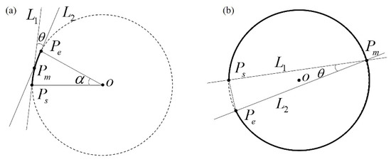 Contour curves with less than 25 pixels are removed, as in Section 2.1.3. Curves whose ratio of arc length to circumference is greater than τ are used to fit the circle. It can easily deduce that, when the curve length is constant, the straighter the curve is, the smaller the ratio. Thus, we defined a curve whose ratio was below or equal to τ, was a straight line, and did not participate in circle fitting. τ was set to 0.2 in the proposed method, and the analysis of the choice is given in Section 3.3.2. See Figure 9a for reference; it should satisfy α > 72° when the ratio of arc length to the circumference is greater than 0.2. We took line L1 and line L2 to calculate θ. L1 was formed by the starting point and the midpoint Pm of the curve. L2 was formed by the midpoint Pm and the endpoint Pe. θ was 0.5 times α according to the simple principle of geometry. Therefore, it was calculated that θ should be greater than 36°.