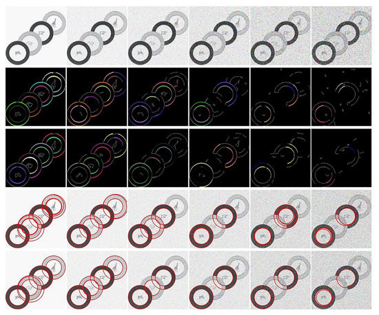 In contrast, the sampling interval and corner point threshold of our improved CTAR was different for each curve. It effectively reduced the detection error of corners. The smoothness of the contour curve decreased as the noise increased, and the original CTAR became more sensitive. Therefore, the result was that the curves retained after curve splitting and filtering became sparser, which led to a smaller number of correct circles in the end. In comparison, the improved CTAR algorithm had higher anti-interference performance and more robust adaptability.