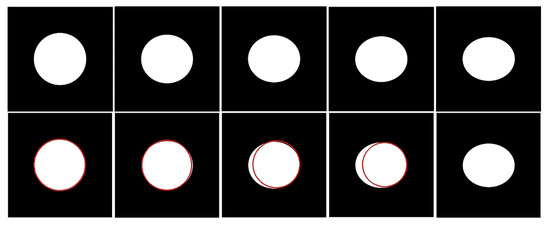 The projection distortion may cause the circle to take on an elliptical shape. Therefore, we also tested whether the proposed method could detect ellipse-like circles. We selected ellipse images with eccentricity e from 0 to 0.54 for the experiment, as shown in the first row of Figure 16. The results are shown in the second row. The results show that our method can accept ellipses with e ≤ 0.47 as circles. This condition is limited by the λ of circle validation in Equation (12). We can accept larger e by slightly increasing λ. However, as the eccentricity increased, the detected circle was also more off the ellipse’s center, and the precision decreased rapidly. Therefore, our method was more suitable for cases where the degree of distortion is not very large.