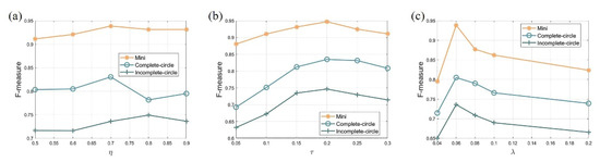 In the curve segmentation stage, η was used to determine how much the sampling interval was affected by the curve length and the image size, and a larger η indicated that the sampling interval was more affected by the curve length. Figure 17a shows that better results could be obtained when η = 0.7 or 0.8. The Mini and Complete-circle datasets had the highest F-measure when η = 0.7, and only the Incomplete-circle dataset had the highest F-measure when η = 0.8. Therefore, we chose to use η = 0.7. We used τ to determine whether a curve was a straight line or not. As τ increased, more curves were judged to be straight lines. The highest F-measure was found on all three datasets when τ = 0.2 according to Figure 17b. Therefore, τ was set to 0.2. λ was used to determine the true and false circles in the circle verification stage, and a smaller value indicated more stringent circle verification. From Figure 17c, the best results were obtained when λ = 0.06. Therefore, λ was set to 0.06 in the proposed method.