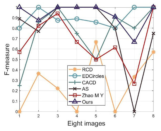 For the Mini dataset, the detection time is shown in Table 1 in milliseconds, and the comparison of the F-measure is shown in Figure 18. RCD required a lot of iterative operations because it used random sampling, which resulted in a much longer detection time than that of the other methods. In comparison, the proposed method had a better performance in terms of the detection time. This was because redundant pixels were removed when performing edge refinement. Moreover, we removed the interference curves segmented in the curve segmentation stage. This effectively reduced the computational effort of circle fitting. The detection time of our method and AS was closer, but the F-measure of the AS was more volatile and even decreased to 0 at the seventh image, as shown in Figure 18. Additionally, the detection times of the other methods were two to four times higher than those of our method.