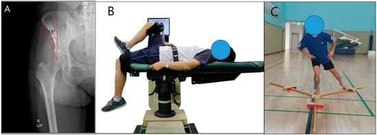 (A) Center edge of angle of hip dysplasia; (B), hip strength test; (C), Y-balance test.