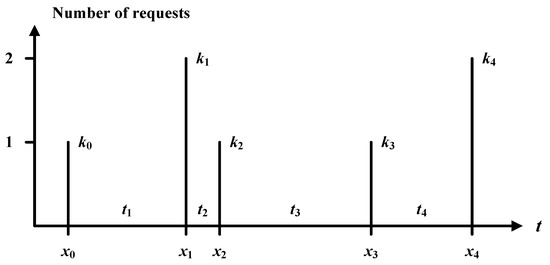 It is expedient to consider the request flow as a sequence defined on the “Time” axis, which is usually denoted by the letter t. On this axis, it is possible to single out time moments, , at which requests arrive at the queuing system input. The values correspond, for example, to those time moments when packets arrive at a multiservice node. The request flow is random. There are also deterministic request flows. For them, the values of are given by the predetermined schedule. The analysis of such a request flow is not related to the study of random variables.
