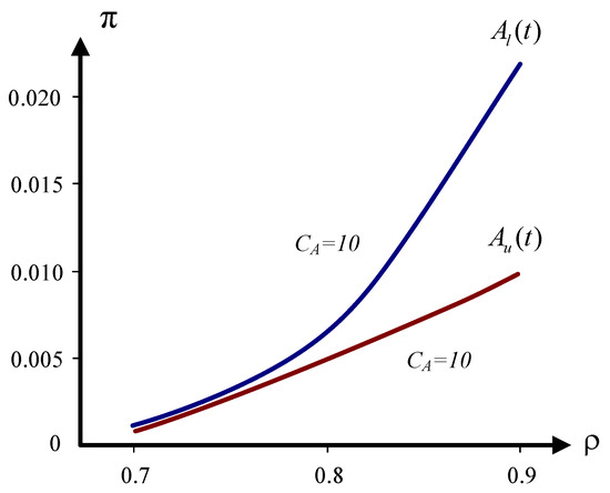 The values of and depend on the load of the queuing system . The greater the load of the queuing system, the closer the values of the parameters and to one. This means, based on Expression (12), that the error can noticeably increase at a large load unless the values of and become very close to each other. To analyze the operation of queuing systems under conditions of a dramatically increasing load, it is appropriate to investigate the dependence of . For this purpose, the value of the service intensity, , should be changed within the limits that allow investigation of the dependence of in the high-load range of interest.