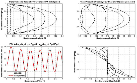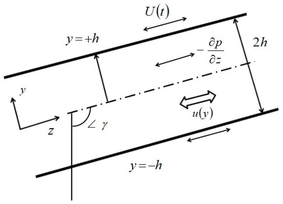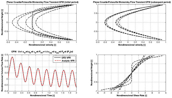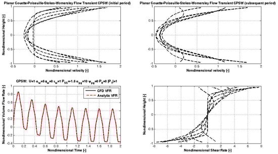 The solutions of the classical fully-developed steady laminar flows, such as the planar Couette (CT) and the planar Poiseuille (PO) flows in an infinite slit, have been known for a long time [1,2,3,4,5,6,7,8,9]. The Couette flow originates in a fluid motion between two coaxial cylinders and is shear-driven (wall-driven). If the radii of the cylinders are large, then planar CT flow is approximated. On the other hand, PO flow is solely pressure-driven. A planar steady-state Couette–Poiseuille (CP) flow is a linear combination of the CT flow with one boundary moving at uniform speed and the PO flow between two fixed infinite plates caused by the steady-state (proverse or adverse) pressure gradients (PG). These classic solutions of the formidable nonlinear Navier–Stokes (N-S) equations also paved the way to early investigation of the flow stability and transition to turbulence [2,5,10]. The Womersley (WO) flow that can be seen as a generalization of the PO flow is pressure-driven caused by oscillating PGs with fixed conduit boundaries. Such flows have also been known for quite some time [4,5,7,11,12,13,14,15] and often under different names too. WO-type flow has important applications in pulsatile arterial hemodynamics and many biological fluid systems [15,16,17].