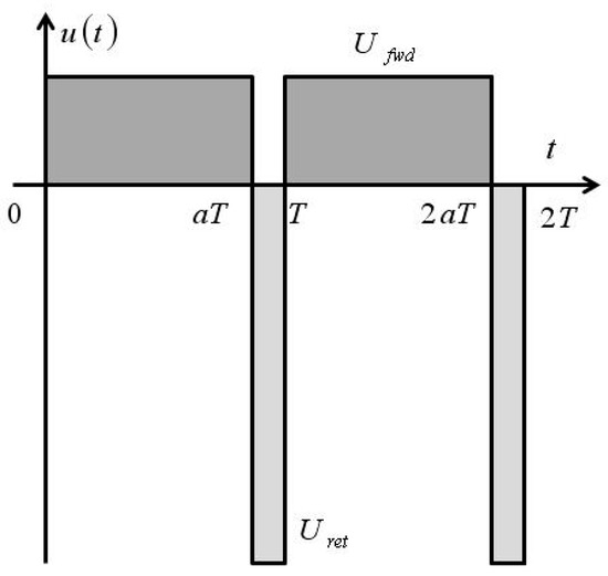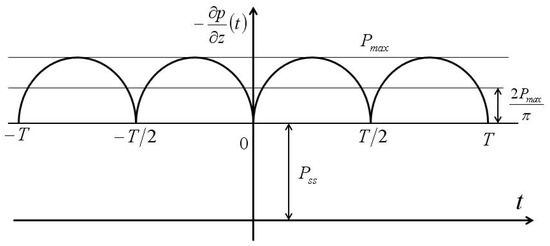 Expressions for oscillating PGs and wall movement are conveniently given in a complex form greatly simplifying theoretical analysis. All periodic functions for the PGs and the BCs are real-valued, thus possessing conjugate symmetry, () [39,40,41,42]. The complex Fourier series can be converted into the classical or the phase form for an arbitrary function: