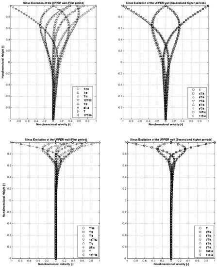 Transforming general CPSW flow into dimensionless form is difficult. There are several choices of the characteristic velocity [5,7]. In the case of the classic CT flow, the plate’s uniform velocity is the characteristic velocity and could never be exceeded in the flow field. For a planar PO flow, the maximum velocity in the center of the parabolic profile which is a function of the uniform PG can be used as a characteristic velocity. For the oscillatory PG (WO-component) we could use amplitude and frequency of any harmonic as a characteristic velocity. It is recommended to use the one with the largest magnitude [7] to ensure range [0, 1], but that is not always possible. Let us now define new dimensionless variables: