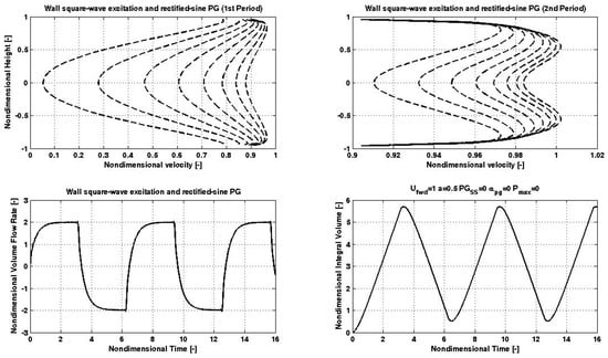 Mean-square convergence does not imply pointwise or uniform convergence [39,40,41,42,43,51,52,53,54]. At the finite points of jump discontinuities of piecewise continuous functions, the Fourier series will converge to the average value of the left and the right limits with Gibbs phenomena and characteristic “ringing” appearing [39,40,41,42,43,51,52,53,54]. Accordingly, the convergence cannot possibly remain uniform. Once we have chosen oscillation waveforms, their Fourier coefficients can be directly substituted into the global solution (Equation (38)). The question of convergence is not the academic one. The nature of convergence strongly affects analytical solutions and computations. From the velocity distribution in the complex form, we can easily derive volume flow rate (VFR):