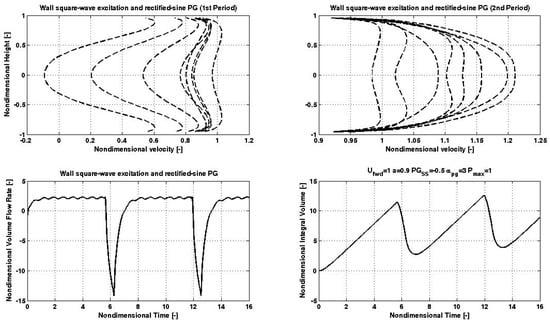 If bounding infinite walls are immovable, we obtain the classical plane PO flow, , with, . In the plane PO flow, the wall velocity is zero and cannot be used for scaling purposes. Therefore, the characteristic velocity is the maximum velocity in the center and dimensionless PG must be , in accordance with Equations (13) and (14).