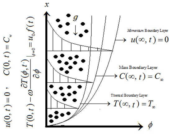Let us consider that an unsteady, in-compressible flow of magneto hydrodynamic (MHD) Oldroyd-B-fluid near an infinitely long vertical flat plate together with slip condition on temperature that is fixed in a porous medium. Initially, at t = 0, suppose that plate and fluid are at rest, with the ambient temperature and the fixed concentration . After a short time, unlike the plate is static but the fluid starts to move with temperature in the form is stabilized, where is a constant represents the velocity dimension, also the plate at the same time having and (temperature and concentration) which remain constant. It is presumed that temperature, velocity and concentrations are considered here are functions of and t only. The geometry of the Oldroyd-B fluid model is presented in Figure 1. Applying the Boussinesq’s approximation with smaller Reynolds number, we obtained the principal governing equation for Oldroyd-B fluid along with initial and boundary condition [26]: