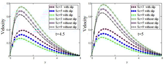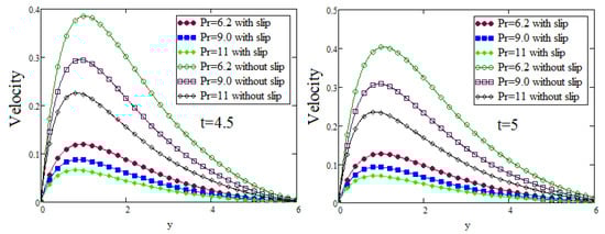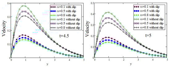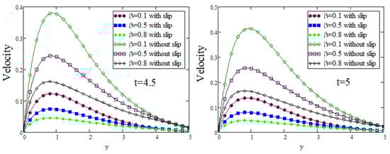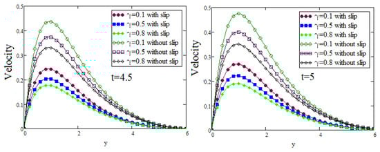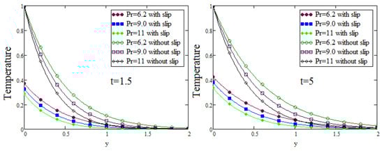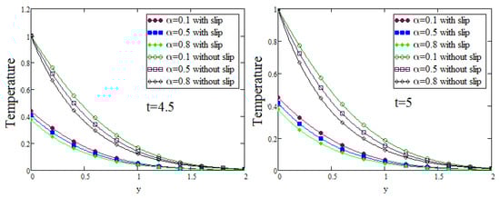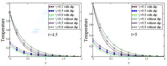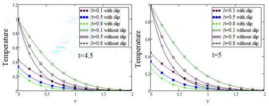 Figure 5 displayed the temperature illustration for different values of at two distinct levels of time, in presence of slip parameter and observed graphical behavior of the curves in the absence of slip parameter. It has been depicted that for large values of , the temperature is falling. Generally, the consistency of thermal boundary layer contracts rapidly as increasing , because of this temperature profile linearly slow down.
