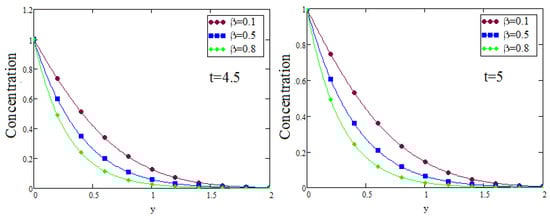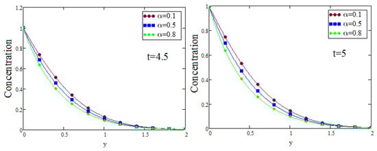 Simulation to illustrate the concentration profile for varying the values of , when , , and .