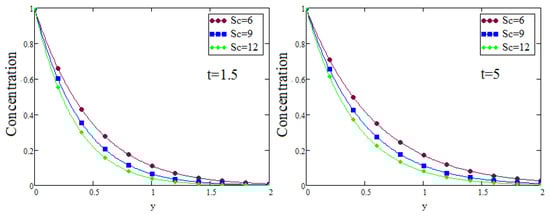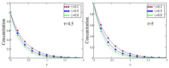 Figure 9 displays the behavior of mass profile versus distinct values of parameter at two distinct levels of time, from graphs it is detected that concentration profile is reduced corresponding to rising values of . The reason behind this phenomenonis that the boundary layer of concentration is reduced when increasing the values of Schmidt number. Concentration is an important factor of velocity field on the movement of the fluid that cannot be overlooked.