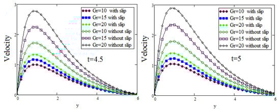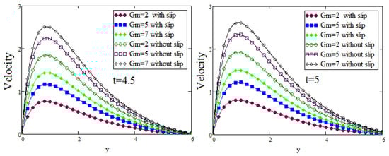 Figure 15 described the impact of by considering the varying values of at two distinct levels of time, in presence of slip parameter and observed graphical behavior of the curves in the absence of slip parameter, on momentum equation. The ratio of buoyancy force to viscous force is generally known as mass grashof number that causes to unrestricted convection. Form these graphs it is depicted that velocity curves are uplifted for increasing the values of .