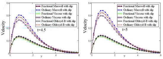 Figure 17 and Figure 18 plotted to make comparison among various fluid models such as the classical Maxwell, fractional Maxwell, fractional Oldroyd-B, ordinary Oldroyd-B, fractional Newtonian and classical Newtonian fluid flow models for both the cases with/without slip conditions at two different times. It is noticed that the figures of Maxwell fluids for both ordinary and fractional cases having higher curves than Oldroyd-B and viscous fluids. Also, it is remarkable to point out that for fractional as well as classical models, the velocity curve perceive the same representation for both the cases with/without slip conditions.