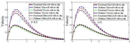 Simulation to illustrate the velocity profile comparison for different fluid models such as fractional Maxwell, fractional viscous, fractional Oldroyd-B, classical viscous, classical Oldroyd-B and classical Maxwell fluids for no slip conditions, when , , , , , , , , , and .