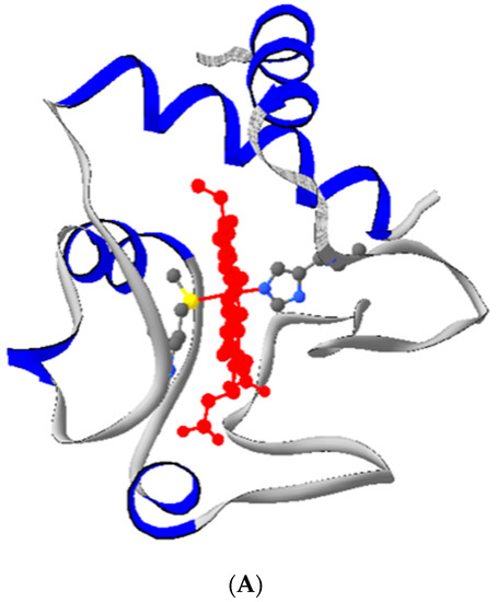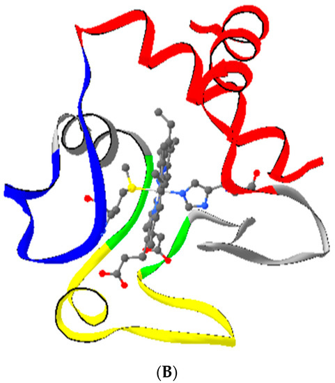 Schematic representation of the ribbon structure of cytochrome c (1HRC.pdb). (A): steric view of the protein in the native conformation, showing the two axial ligands of the heme iron: His18 (right) and Met80 (left). The heme is shown in red color; the alfa-helix regions are in blue. (B): Schematic representation of the ribbon structure of cytochrome c (1hrc.pdb) which highlights the regions (indicated by different colors) that make up the five folding units (foldons) of the macromolecule [8]. The foldons are shown as follows: the red unit (consisting of the N- and C-terminal helices), the grey unit (consisting of the 60s helix and the 19 s–36 s omega-loops), the green unit (comprising residues 37–39 and the 58–61 residues), the blue unit (the omega-loop D, comprising the 71–85 residues) and the yellow unit (the omega-loop C, comprising the 40–57 residues). The heme is shown in grey, bound to His18 (right) and Met80 (left). The stability of foldons is as follows: red unit > grey unit > green unit > blue unit > yellow unit. The protein structure was visualized with the Swiss-Pdb Viewer software (http://www.expasy.org/spdbv/ accessed date 12 March 2022).